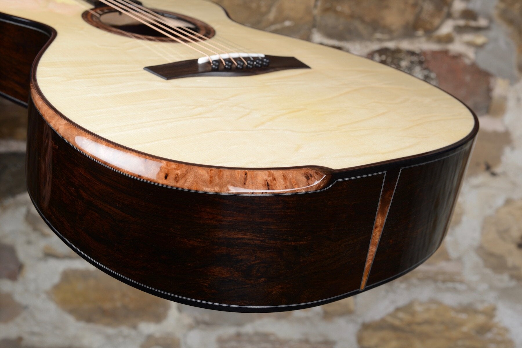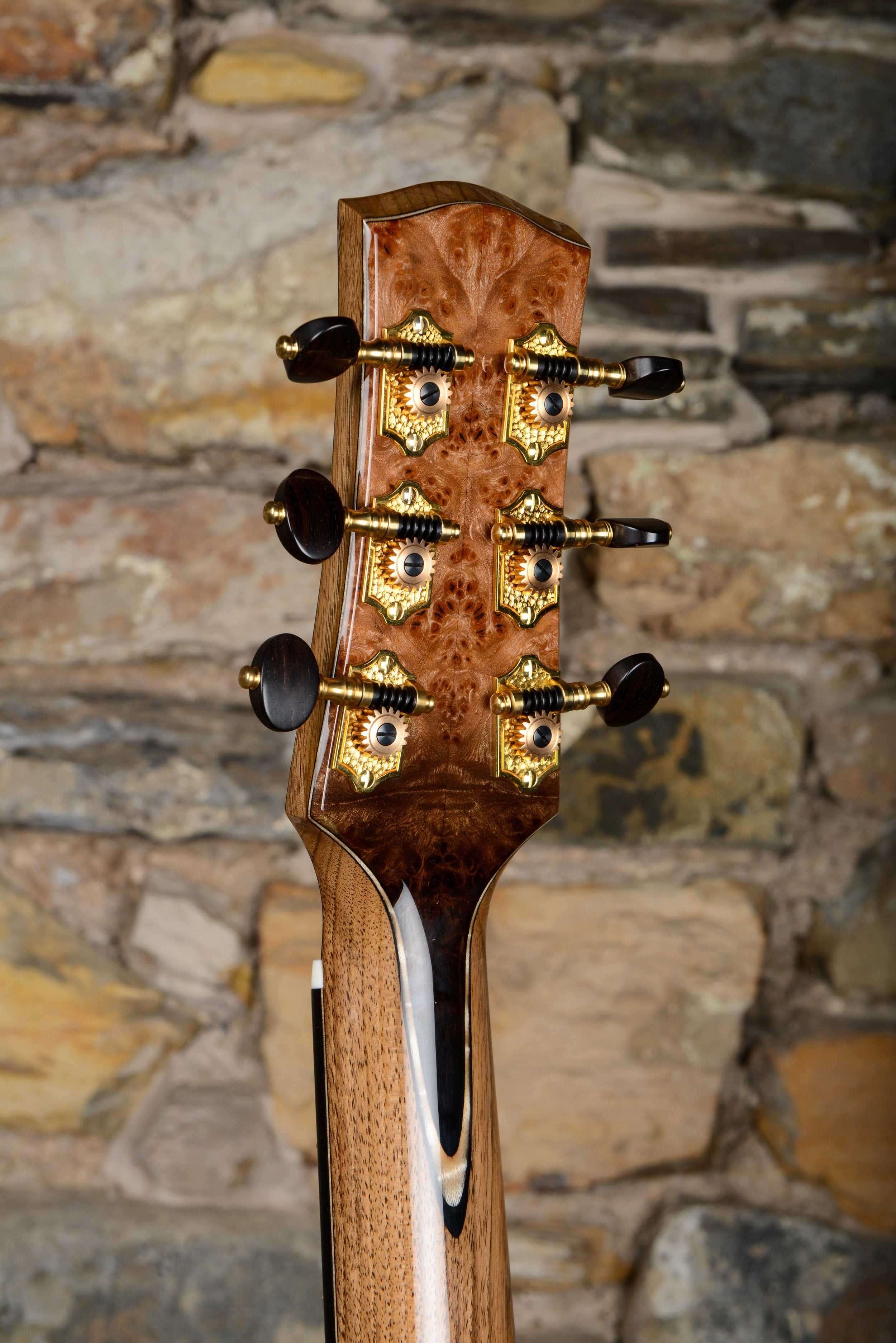 Signature features of many of Taran's builds are the burled woods used for the arm bevel and headstock overlays, paired with hot sand fades that provide an incredible level of detail.
