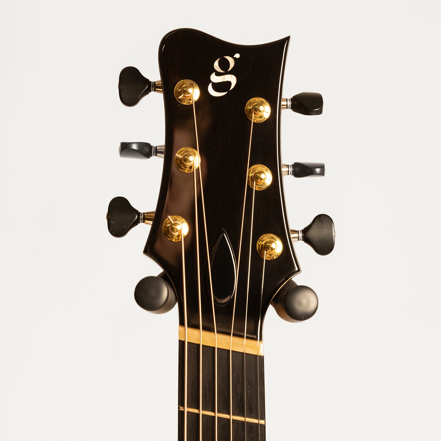 - Natural, unbleached bone nut and ¼" saddle Gold Greenfield "g" 510 tuners, ebony buttons