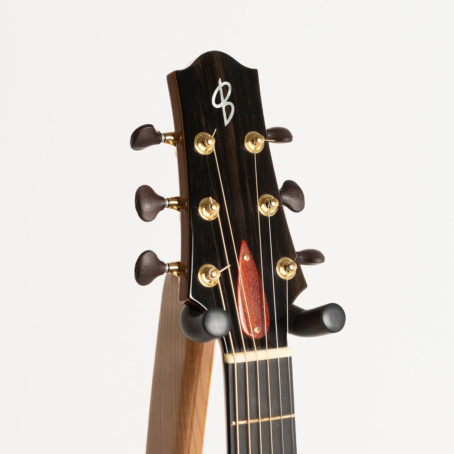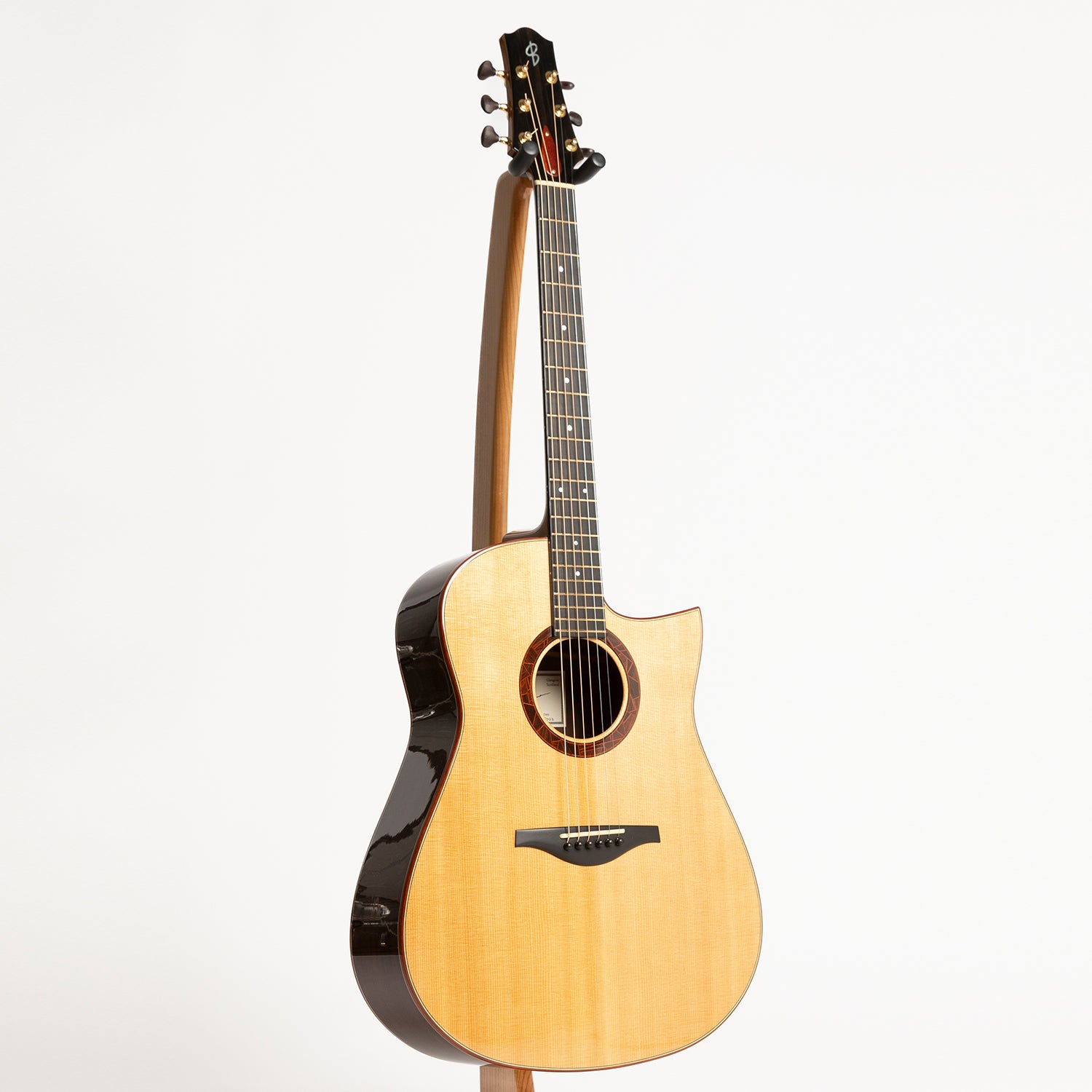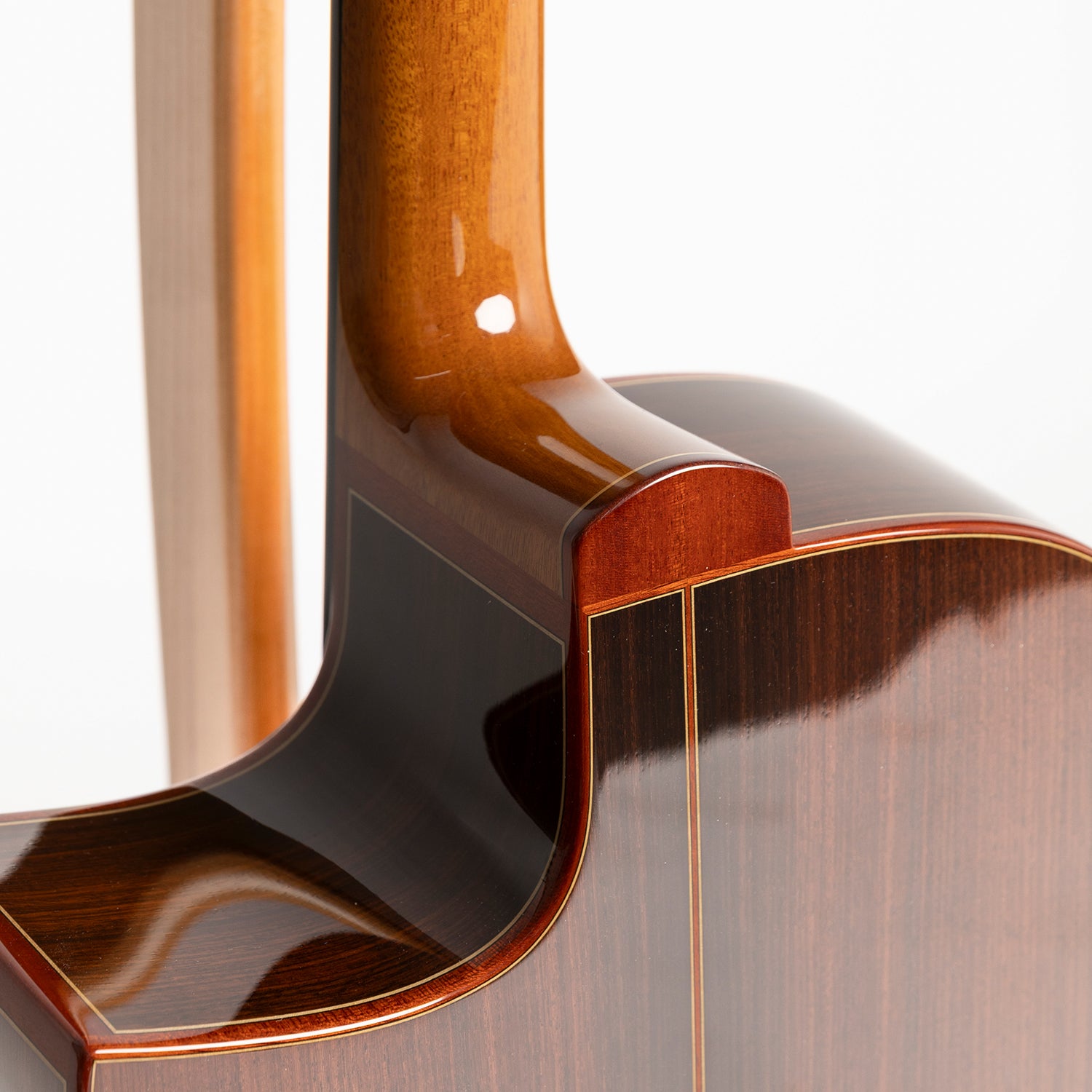 A mahogany neck with carbon fibre inserts is topped by an ebony fingerboard. The guitar is decorated with bloodwood binding as well as a rosewood and bloodwood mosaic rosette.